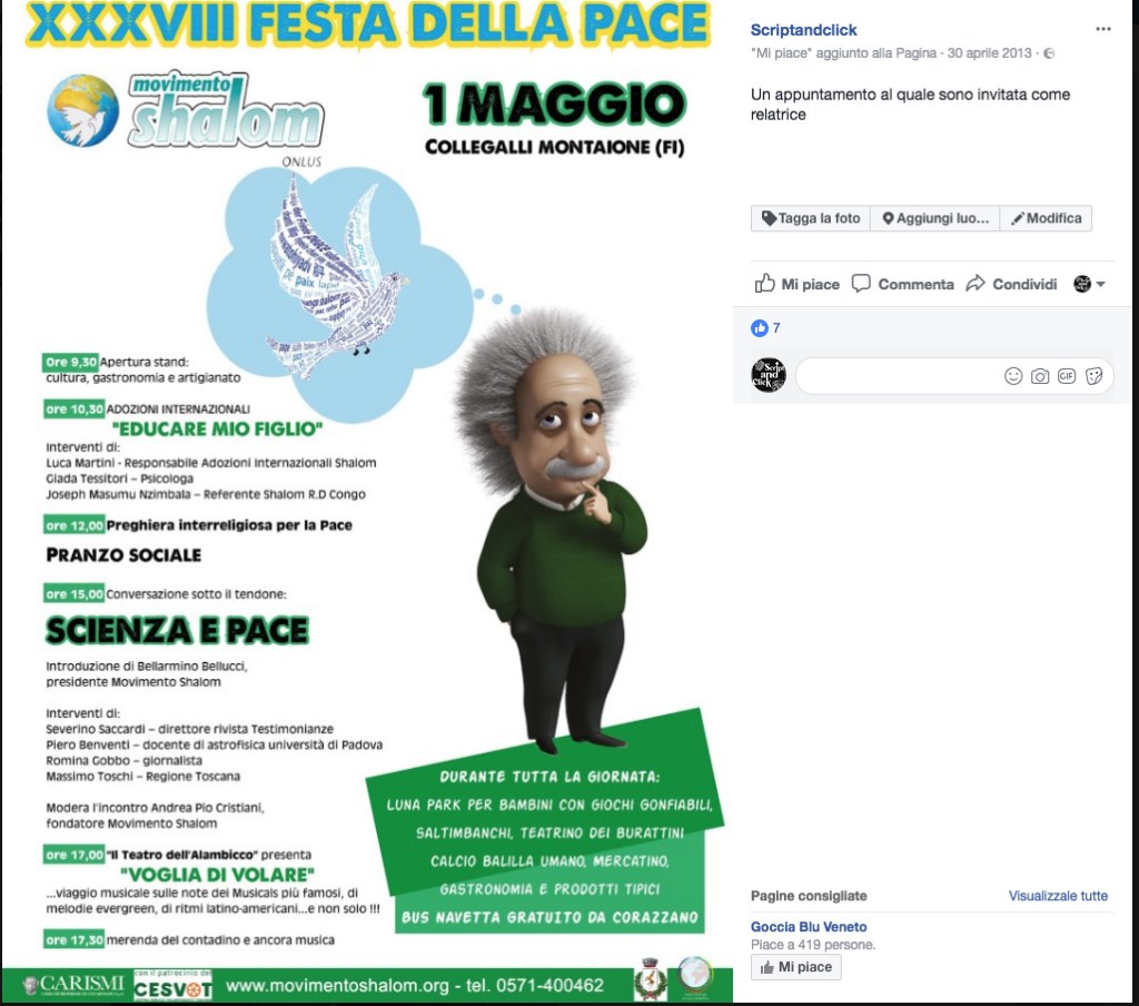 Sono stata invitata dal Movimento Shalom di San Miniato (Pisa) a parlare di “Social media e pace”, in una “conversazione sotto il tendone” con Severino Saccardi, direttore della rivista “Testimonianze”, Piero Benvenuti, docente di astrofisica dell’Unviersità di Padova,, e Massimo Toschi, Regione Toscana. Ha introdotto Bellarmino Bellucci, presidente Movimento Shalom, e moderato don Andrea Pio Cristiani, fondatore Movimento Shalom. Il nostro evento era all’interno della XXXVIII Festa della pace, che si è svolta il primo maggio 2011 a Collegalli Montaione, in provincia di Firenze. La giornata era stata aperta dall’incontro intitolato “Educare mio figlio”, che ha visto gli interventi di Luca Martini, responsabile Adozioni internazionali Shalom, della psicologa Giada Tessitori e di Joseph Masumu Nzimbala, referente Shalom Repubblica Democratica del Congo.