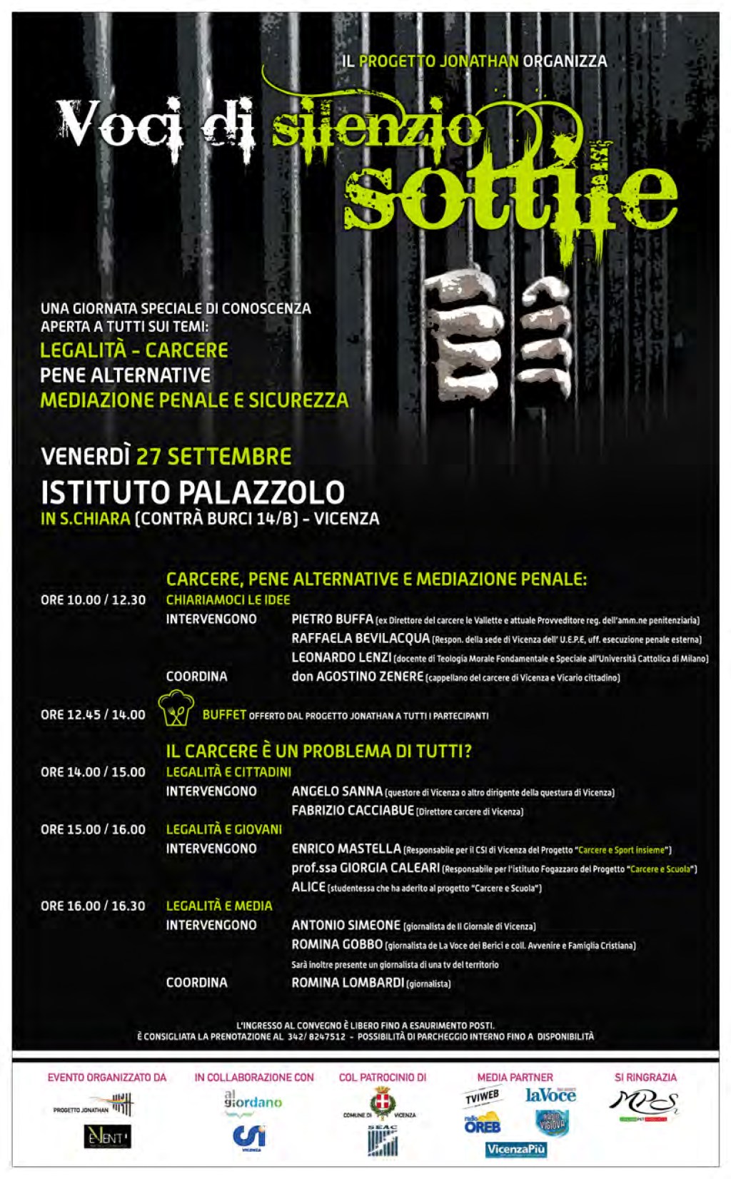Non passa giorno che i Media non riservino spazio a notizie legate al cosiddetto “pianeta carcere”. Ultime, ma solo in ordine di tempo, quelle pubblicate sul nuovo decreto legge del 1 luglio scorso. Il sovraffollamento delle carceri è all’ordine del giorno dei politici e ai primi posti dell’agenda setting di un Paese come l’Italia che è guardata a vista, su questo, dall’Europa. Ma, nonostante un contesto di estrema mobilitazione, almeno verbale e mediatica, parole come pene alternative, recidiva, mediazione penale, giustizia riparativa, reinserimento sociale e alcune informazioni basilari sull’ambiente del carcere sono sconosciute ai più, così come, purtroppo, molto frequentemente, rimane nell’ombra il soggetto-vittima, troppo spesso citata, negli ambienti carcerari, in considerazione di una pena risarcitoria (giorni di carcere e pene pecuniarie) ma mai all’interno di una valutazione psicologica. Ecco perché, il Progetto Jonathan, casa-accoglienza con sede a Vicenza per detenuti in pene alternative – da anni in prima fila per portare una corretta informazione su queste tematiche – organizza, venerdì 27 settembre 2013, non una giornata di sensibilizzazione, ma una giornata di conoscenza sui temi citati che va oltre i confini degli addetti ai lavori e che prevede un convegno a ingresso gratuito aperto alla cittadinanza e un Progetto di avvicinamento che coinvolge una cordata di Media esaltandone il ruolo di servizio pubblico su un tema quanto mai delicato e spesso reso tabù.