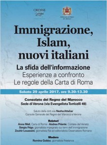 Grazie a Motta Abdessamad per aver recensito la giornata di formazione per giornalisti, dal titolo “Immigrazione, Islam, nuovi italiani. Le sfide dell’informazione. Esperienze a confronto. Le regole della Carta di Roma”, che ho organizzato sabato 29 aprile 2017 nella sede del Consolato del Regno del Marocco in Verona. Relatori: Andrea Priante del Corriere del Veneto, Sergio Frigo, già caposervizio al Gazzettino, ed esperto dei temi legati all’immigrazione e inclusione, Anna Meli, fondatrice Carta di Roma e direttrice comunicazione del Cospe, Zouhir Louassini, giornalista Rai ed editorialista dell’Osservatore Romano.