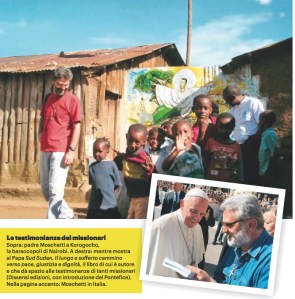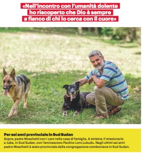 tornai in chiesa e mi riconciliai profondamente con Dio». Ormai il Signore bussava alla porta di casa Moschetti. «Iniziai il postulato a Firenze, dove ho vissuto uno dei periodi più belli della mia vita: esperienze con i rom, con gli immigrati, così ho cominciato davvero a capire che cosa significa essere missionario». Da lì, Korogocho, Palestina e Sud Sudan. «Io provinciale? Non mi sento pronto». E invece provinciale per sei anni, vivendo prima l’entusiasmo del popolo sud sudanese – che finalmente, dopo quarant’anni di guerra, nel 2011 otteneva la sua indipendenza dal Sudan – e poi il dolore per la riaccensione del conflitto nel 2013, non più tra nord e sud, bensì etnico e interno al sud, tra il presidente Salva Kiir e il vice-presidente Riek Machar, in un’escalation che ha creato una crisi umanitaria tra le più drammatiche di ogni tempo. Così ad aprile 2017 padre Moschetti è partito pellegrino per 1.100 chilometri sulla via di Santiago di Compostela per pregare per quel popolo senza pace. «In cammino con la bandiera del Sud Sudan, scoprivo anche lì ancora un’umanità dolente. Persone che arrivavano da tutto il mondo, tutte accomunate dalla stessa ricerca di qualcosa di vero e autentico. Nell’incontro con queste persone ho riscoperto ancora una volta che Dio è sempre a fianco di chi lo cerca con il cuore».