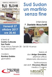 Serata interessantissima (come sempre quando sono io a organizzare), aperta dal saluto di don Arrigo Grendele, direttore Ufficio missionario diocesano, al centro culturale San Paolo di Vicenza con il padre comboniano Daniele Moschetti, provinciale in Sud Sudan per sei anni, dopo un’esperienza fortissima a Korogocho, la discarica di rifiuti tossici alla periferia di Nairobi, in Kenya, ed un periodo in Palestina, altro territorio lacerato. Il missionario ha presentato il suo ultimo libro “Sud Sudan. Il lungo e sofferto cammino verso pace, giustizia e dignità”, per i tipi della Dissensi Edizioni, che è un viaggio attraverso le vicissitudini di questo Paese africano, “impoverito dal petrolio”. Sembra un ossimoro, ma questa risorsa che potrebbe essere il motore dello sviluppo, si è in realtà rivelata una maledizione, perché è diventata il centro degli interessi delle grandi potenze internazionali e regionali. Ottimo testimone sul campo, il dottor Vincenzo Riboni, medico Cuamm, ha raccontato la disastrosa situazione sanitaria del Sud Sudan, specialmente da quando, nel 2013, è ripiombato in un conflitto sanguinario. «Mai curato tante ferite di arma da fuoco, come in quest’ultimo periodo», ha detto. E io ho moderato. Siccome ci siamo dimenticati di fare foto, ripubblico quella con padre Daniele in occasione dell’intervista che gli feci, uscita su Credere del 29 ottobre.