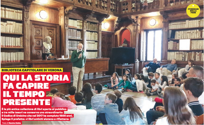 «Papà, quand’è che andiamo ancora da quel signore che racconta quelle favole bellissime?». Il signore in questione è don Bruno Fasani, prefetto della Biblioteca capitolare di Verona, la biblioteca funzionante più antica al mondo. Le “favole” sono quelle che emergono dal suo prezioso contenuto: oltre 1.200 manoscritti, 245 incunaboli, 2.500 cinquecentine, 2.800 seicentine, 11 mila pergamene. «Se un bambino ha vissuto un racconto storico con lo stesso stupore che prova davanti a una favola, allora capisci che bisogna tornare a raccontare la storia, ma non come un rincorrersi di date e di fatti politici, bensì a partire dalla complessità umana». Alla Capitolare studiarono il figlio di Carlo Magno, Pipino, Dante Alighieri, Francesco Petrarca e molti altri nomi illustri. Questo tesoro è sopravvissuto al terremoto, alla peste, alle ruberie di Napoleone, all’alluvione del 1882, ai bombardamenti della Seconda guerra mondiale. Ed è arrivato fino a noi per raccontarsi e raccontare un passato di cui rischiamo di perdere traccia.