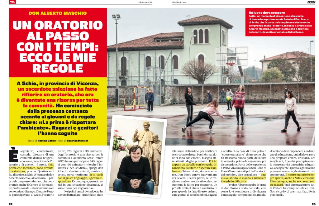 È segretario, centralinista, custode, direttore di una comunità di nove religiosi, economo, incaricato dell’oratorio e fa anche… il prete. «Ma, prima che sacerdote, sono diventato salesiano», precisa. Quattro anni fa, all’arrivo a Schio (Vicenza) di don Alberto Maschio, all’oratorio – parte del complesso salesiano che comprende anche il Centro di formazione professionale – stazionavano solo ventenni perditempo. Durante l’estate partecipavano al Grest, l’oratorio estivo, 120 ragazzi e 30 animatori. Oggi l’oratorio è una risorsa per la comunità e all’ultimo Grest (estate 2017) hanno partecipato 540 ragazzi con 160 animatori. «Perché l’iniziativa è ben studiata», spiega don Alberto. «Invito cantanti, musicisti, artisti, porto testimoni». Se si parla con il giusto linguaggio, i giovani rispondono. E comunque, quando arrivi in una situazione disastrata, ci vuole poco per migliorarla». Nei primi tempi don Alberto ha dovuto battagliare. «Ho chiesto aiuto alle forze dell’ordine per verificare se circolasse droga. Perché si sa, dove ci sono adolescenti, bisogna stare attenti. Meglio prevenire. Poi ho appeso un cartello con le regole. Innanzitutto, salutare, e rispettare l’ambiente. Chi non ci sta, si scontra con me. Don Bosco amava i giovani, ma era severo. D’altra parte, se io voglio un ambiente educativo, devo assumermi la fatica per ottenerlo. Un po’ alla volta il clima è cambiato. Il passaprola ha fatto il resto. Adesso ogni giorno ci sono bambini, ragazzi e adulti». Alla base di tutto pulsa il “cuore oratoriano” di un uomo che ha trascorso buona parte della vita in oratorio, prima da ragazzino, poi da sacerdote. Forte delle esperienze a Porto Viro (Rovigo) e a San Donà di Piave (Venezia) – «il più bell’oratorio del mondo», dice orgoglioso – oggi il suo istituto lo manda a rilanciare i luoghi in difficoltà. Per don ALberto seguire le orme di don Bosco è stato naturale, così come lo è continuare a divulgarne il messaggio, sempre molto attuale. «L’oratorio deve rispondere a un bisogno di educazione, quindi deve avere una proposta chiara, cristiana. Chi sceglie noi, è perché percepisce nelle nostre attività uno spirito educativo, accogliente. Questo significa una presenza costante, devi esserci tutti i pomeriggi. Il nostro oratorio è sempre aperto, anche a Natale e Pasqua. E io sono qua, anche se ci sono solo tre ragazzi. Vuol dire trascorrere tutta l’estate fra campi scuola e Grest. Non ricordo di aver mai fatto ferie personali». Alla luce dei tempi e dei cambiamenti, anche gli strumenti vanno rinnovati. «L’oratorio non può più essere quello di cinquant’anni fa, perché la società è cambiata. E i bisogni sono altri. Una volta le uniche proposte – cinema, sport, musica – erano le nostre; oggi queste sono diventate attività laiche. Pertanto, o ci adattiamo e progettiamo un’offerta appetibile, oppure chiudiamo. Dunque, se offro il Grest, prima formo gli animatori. Se faccio calcio, lo devo fare bene. Non vado a predicare alla squadra, ma cerco un buon allenatore che la faccia giocare. E io sto con loro. Poi magari arriveranno anche i discorsi di fede».