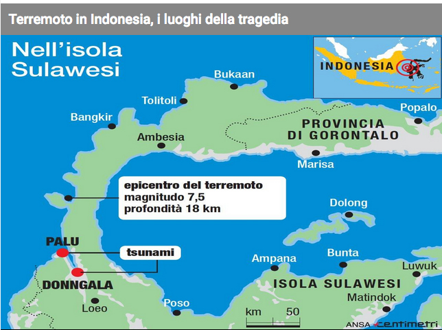 Ieri stavo in autostrada prestissimo. Ho visto sorgere il sole. Bellissimo. Mi sono detta di ricordarmi sempre che non si deve dare tutto per scontato, ma ringraziare perché ogni giorno è un nuovo giorno. Per gli egizi ogni giorno la vita ripartiva. Un amico si chiede: «Il sorgere del sole ogni giorno è per molti una certezza. Ma è anche una verità?» Non lo so. So però che un terremoto di magnitudo 7,5 ha colpito l’Indonesia e provocato uno tsunami che si è abbattuto con virulenza sull’isola di Sulawesi. Sono già 850 le vittime. Significa un piccolo paese, ma è un numero destinato a salire perché molti sono ancora dispersi. Le infrastrutture sono in ginocchio. Gli ospedali faticano a sostenere il continuo afflusso di feriti. Anche per gli indonesiani il sole continua a sorgere, ma in questi giorni illumina e riscalda una desolazione che mai avrebbero voluto vedere.