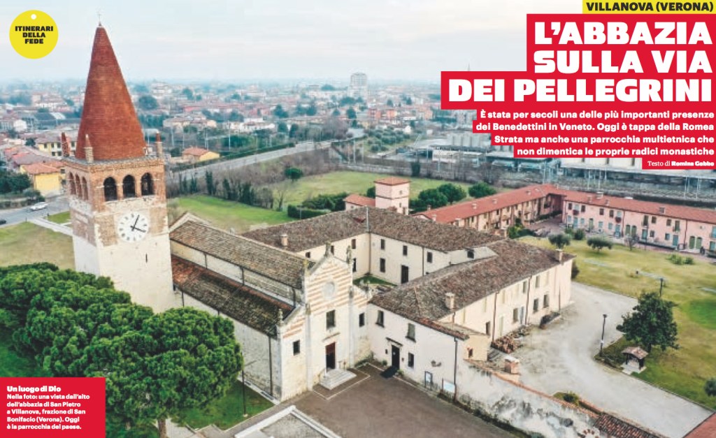 Sono molti i fedeli che arrivano nell’abbazia di Villanova posta lungo l’antica via consolare Postumia (oggi strada regionale 11), tra Verona e Vicenza, in comune di San Bonifacio. Il complesso monastico è stato uno degli insediamenti benedettini più importanti del Veneto. Oggi è inserito nella Romea Strata (il sistema di strade di pellegrinaggio ideato dall’Ufficio pellegrinaggi della diocesi di Vicenza), così i pellegrini provenienti da tutta Europa e diretti a Roma o in Terra Santa, sostano per un “bagno di spiritualità”. Tra i visitatori ci sono anche i devoti del venerabile don Giuseppe Ambrosini, il cui corpo è conservato nella cripta. Nato nel 1884 da Luigi Ambrosini e Marianna Verzini, prima mezzadri, poi proprietari dell’abbazia. Innamorato dell’Eucaristia fin da bambino, sceglie il seminario e il 30 luglio 1911 è ordinato sacerdote dal vescovo Ferdinando Rodolfi. La salute, ben presto minata dalla tubercolosi, non gli impedisce di adoperarsi per gli altri. Muore il 31 marzo 1913. Papa Giovanni Paolo II, nel 1990, ne riconosce l’eroicità delle virtù. Oggi don Giuseppe è per tutti «il santo dell’abbazia». A lui si ricorre per chiedere la grazia della salute. A visitare l’abbazia sono anche i turisti, attirati dalla bellezza di questo gioiello dell’architettura romanica veronese, scrigno di opere d’arte: dal ciclo pittorico sulla Vita di san Benedetto (attribuito alla bottega di Martino da Verona, e realizzato nei primi anni del 1400) all’ancona marmorea di San Pietro addossata all’abside centrale e attribuita allo scultore Antonio da Mestre (fine 1300 – inizi 1400); dalla Pietà (circa 1400) sull’altare della navata sinistra, attribuibile a una maestranza austriaca, al paliotto bizantino e alla bella Annunciazione che si trovano nella cripta.