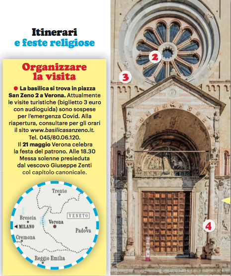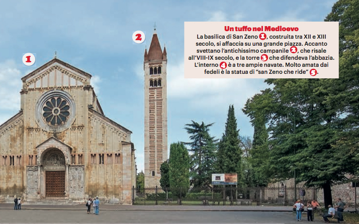 Il monastero zenoniano crebbe d’importanza nel tempo. Dopo la costruzione dell’attuale basilica, «i pellegrini arrivavano sulla piazza antistante e restavano incantati davanti alla meravigliosa facciata romanica dove – dice l’abate -, è espressa una delle più belle sintesi di arte e fede. In particolare, in due elementi all’apparenza contradditori ma ricchi di significato. Uno è la “Ruota della Fortuna” (nel senso latino di “destino”), circondata da sei statuette che indicano le alterne vicende della vita: dalla prosperità alla disgrazia. Ma è la Fortuna stessa che dice: “Chi confida in me, è uno sciocco”. Il fatalismo non è il senso della vita. E, allora, qual è? La risposta è impressa ancora sulla pietra, è il Credo cristiano: “Credo in Dio Padre onnipotente, Creatore di tutte le cose…”; è lì il senso. Poi c’è un bel Giudizio universale, che oggi non si vede quasi più, ma al tempo era la Bibbia di chi non sapeva leggere». Molto importante è anche il portale sull’ingresso principale. La porta in legno a due battenti è ricoperta da 73 formelle in bronzo che risalgono al XII secolo, tra le più antiche del loro genere. Il portale, dello stesso XII secolo, è opera del maestro Niccolò, circondato da 18 altorilievi con Storie dell’Antico e nuovo Testamento. All’interno, da non perdere, la Pala di San Zeno di Andrea Montagna.