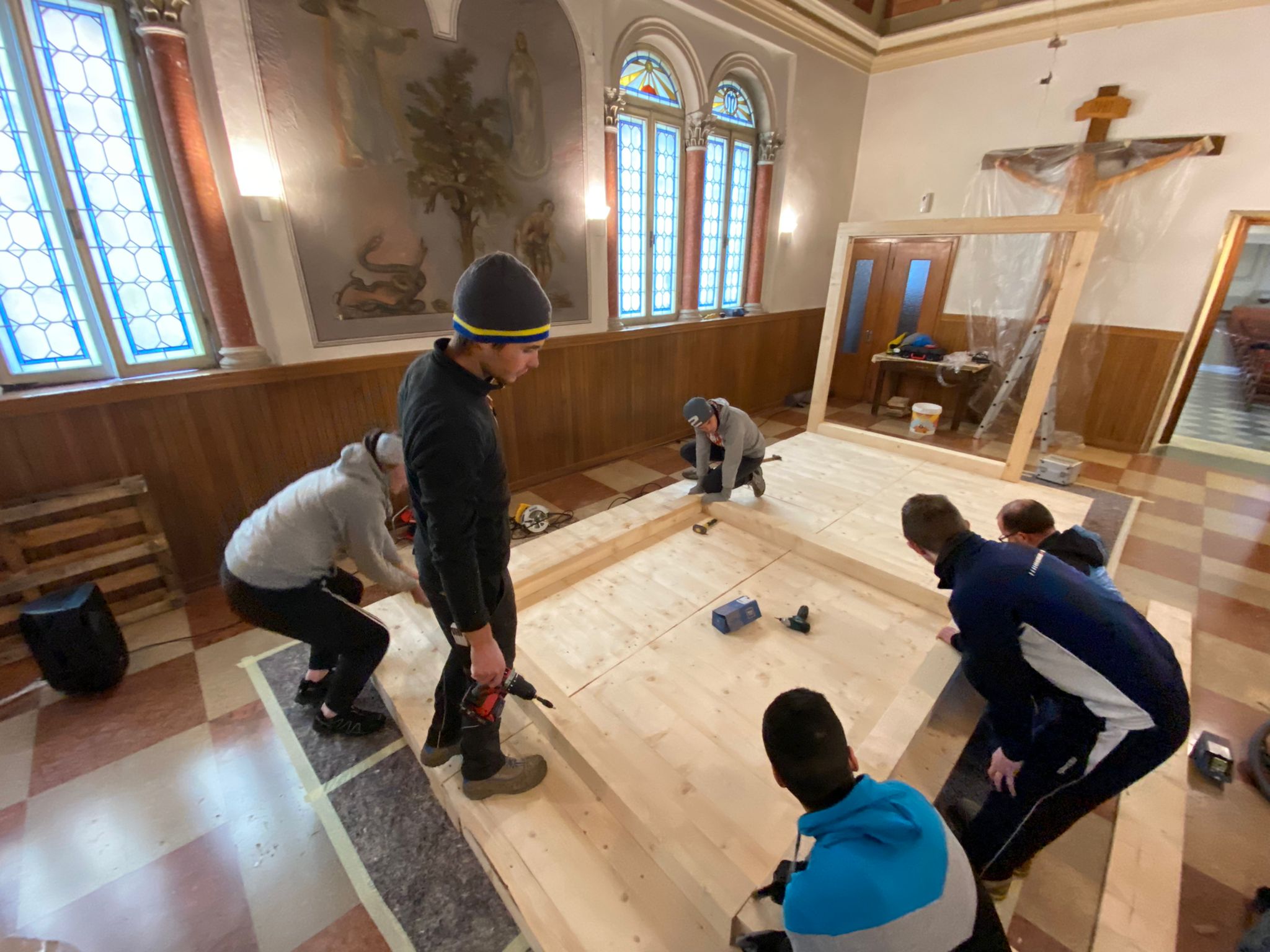 È Schivo di cognome e un pochino anche di fatto, Tommaso, del Gruppo di pastorale giovanile della parrocchia di San Bartolomeo di Gallio, sull’Altopiano dei Sette Comuni (provincia di Vicenza, diocesi di Padova). Tocca a lui – studente di Costruzioni all’Itis di Treviso – raccontare per primo com’è nato il presepe che sarà allestito, dal 10 dicembre al 10 gennaio 2022, nell’Aula Paolo VI, in Vaticano. Si fa un po’ desiderare, ma poi volentieri comincia a descrivere, partendo dall’elemento focale, la stalla, rifugio della Sacra Famiglia, realizzata a grandezza naturale con il legno degli alberi abbattuti dalla tempesta Vaia, per poi passare alle statue in vetroresina, anch’esse ad altezza naturale. Ci incontriamo nella parrocchiale di Gallio, dove il sogno è cominciato. Sebastiano, Patrik, Emanuele, Riccardo, Eugenio, Alessia, Giovanni, Silvia, Filippo, Benedetta, Giacomo, Michele, Giandomenico, Matteo, Sofia, Francesco, Davide sono gli artefici del manufatto. Hanno circa vent’anni, si frequentano dalle scuole medie, sono tutti impegnati in parrocchia e, negli anni, hanno condiviso numerose esperienze. Comprese quelle “di periferia” dalle quali è nata l’idea di scrivere al Governatorato della Santa Sede. «Il servizio prestato alla mensa della Caritas di Roma, ed ecco la ciotola del cibo – dice Benedetta -. Le stampelle di legno, invece, ci ricordano la nostra settimana di condivisione con persone con disabilità accolte all’Opera della Provvidenza Sant’Antonio a Sarmeola di Rubano (Padova); questi luoghi di dolore ci hanno segnato come gruppo, e ci siamo accorti di avere ricevuto più di quanto abbiamo dato».