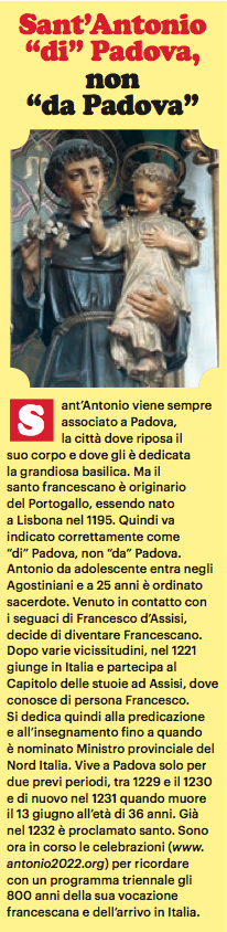 La devozione a Sant’Antonio, che era di origine portoghese, è presente in tantissime città, in Italia e all’estero. Egli predicava nelle strade e nelle piazze perché le chiese non bastavano a contenere i suoi fedeli. «Quando ho scelto questa famiglia religiosa ero affascinato da Francesco di Assisi, Antonio lo conoscevo poco, l’ho avvicinato più tardi e ciò che mi ha colpito e mi colpisce di più è il suo… silenzio. Ha scritto molto, ma usa continuamente citazioni. Per cui alla fine ti resta il dubbio: che cosa ci sarà di Antonio in questi scritti? Lui era talmente impregnato di Parola di Dio e di fonti patristiche che, davanti a questi grandi tesori, ha preferito il silenzio. Non significa dire nulla, bensì essere segno di un ascolto di Dio. Come se dicesse: non ascoltate me, ascoltate Colui che parla al vostro cuore attraverso la preghiera. L’altro suo lato che ammiro è la testardaggine nel difendere sempre i poveri e chi subisce ingiustizie. Egli tuona contro le piaghe più acute del suo tempo. Tuona contro la piaga dell’usura, così come tuona contro la corruzione di prelati e sacerdoti».