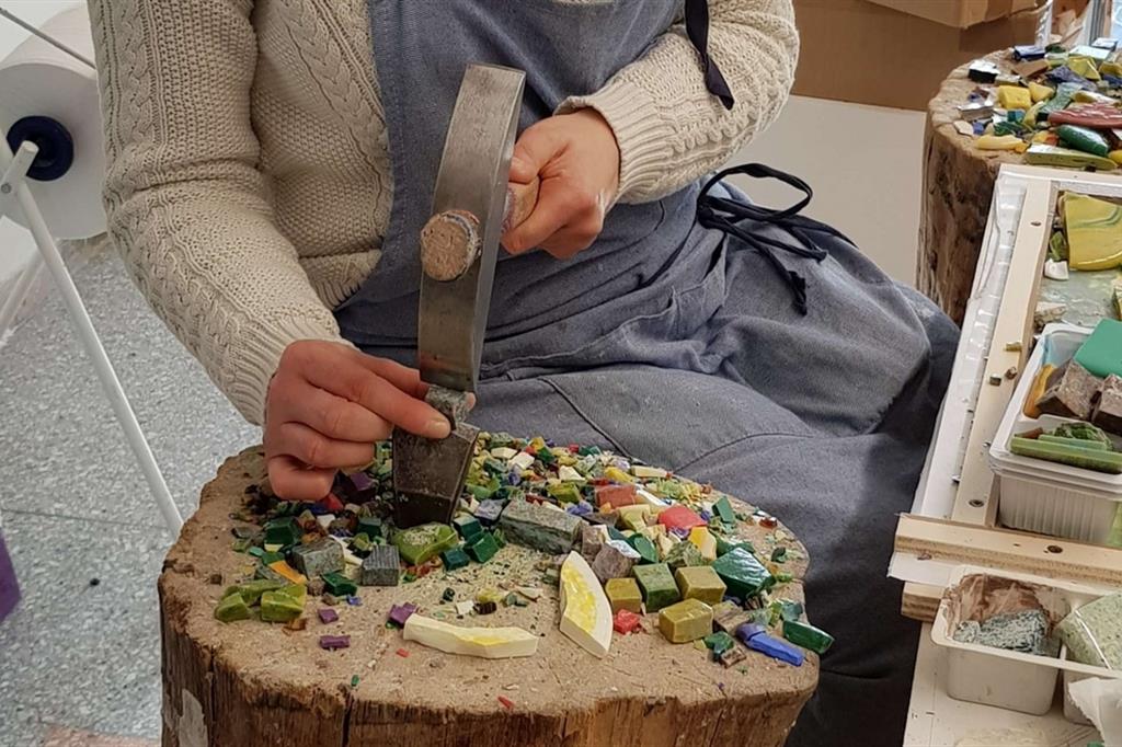 Entrare alla Scuola Mosaicisti del Friuli di Spilimbergo (Pn) significa prima di tutto immergersi nella bellezza. Di un edificio degli anni ’30, dove tutto parla di abilità musive millenarie tramandate nei secoli. Dai pavimenti che ricordano le case romane, alle pareti dove troneggiano centinaia di opere che si rifanno ad epoche varie, ai gradini delle scale, ognuno con geometrie e colori diversi. «Sono gli studenti che, di anno in anno, contribuiscono ad abbellire l’edificio – spiega il direttore della Scuola, Gian Piero Brovedani –. Noi siamo anche una galleria. Nel 2019 abbiamo avuto 37.000 visitatori». Con la firma della convenzione tra il Comune di Spilimbergo e la Società Umanitaria di Milano, il 3 gennaio 1922 la scuola aprì i battenti. Un secolo dopo, sabato 22 gennaio, nell’edificio di via Corridoni, si sono aperti i festeggiamenti per il centenario, che dureranno tutto l’anno. «Sarà anche un modo per ragionare sullo sviluppo di una cittadina che ha nel suo patrimonio culturale proprio il mosaico », dice il presidente Stefano Lovison.