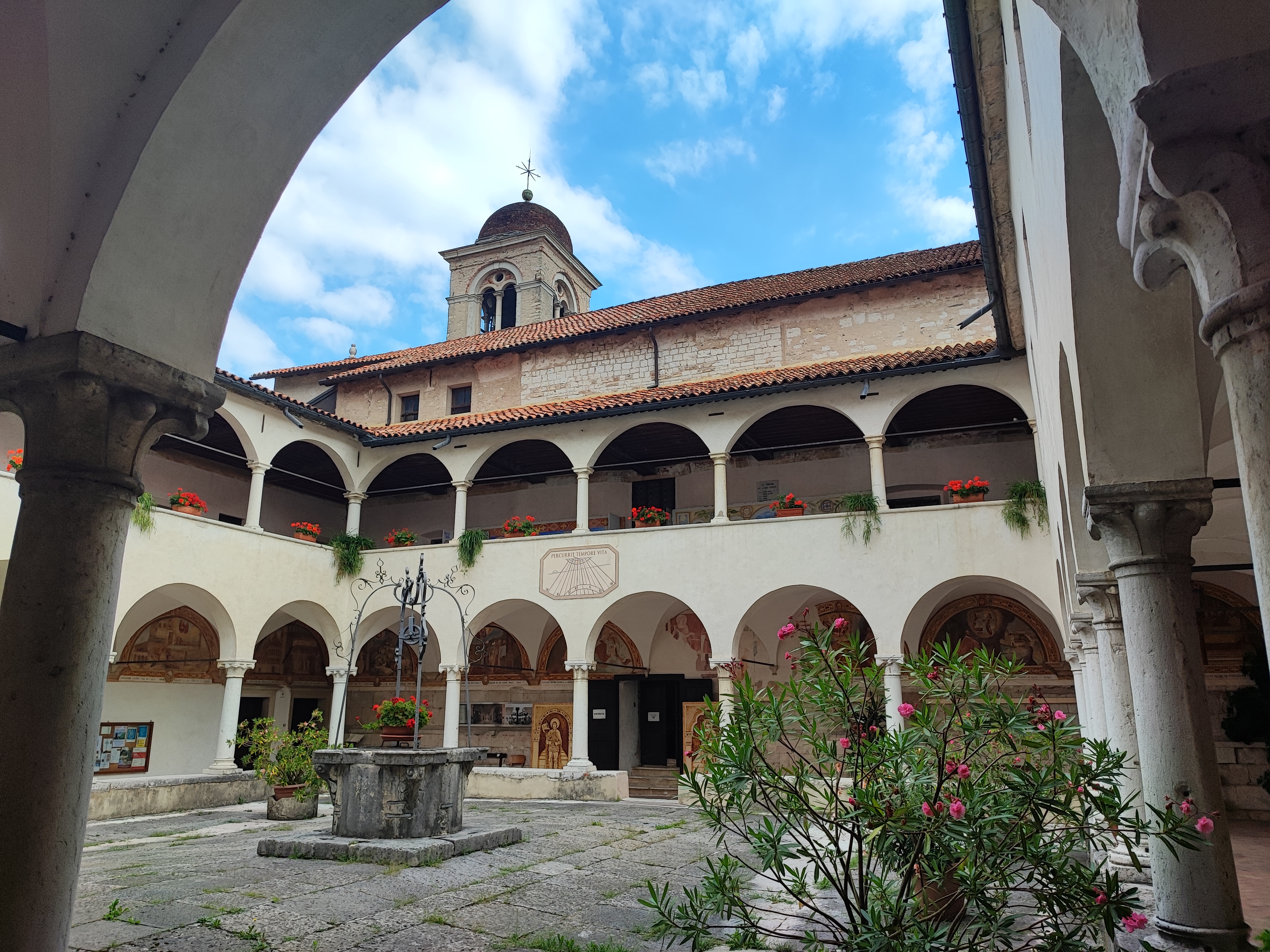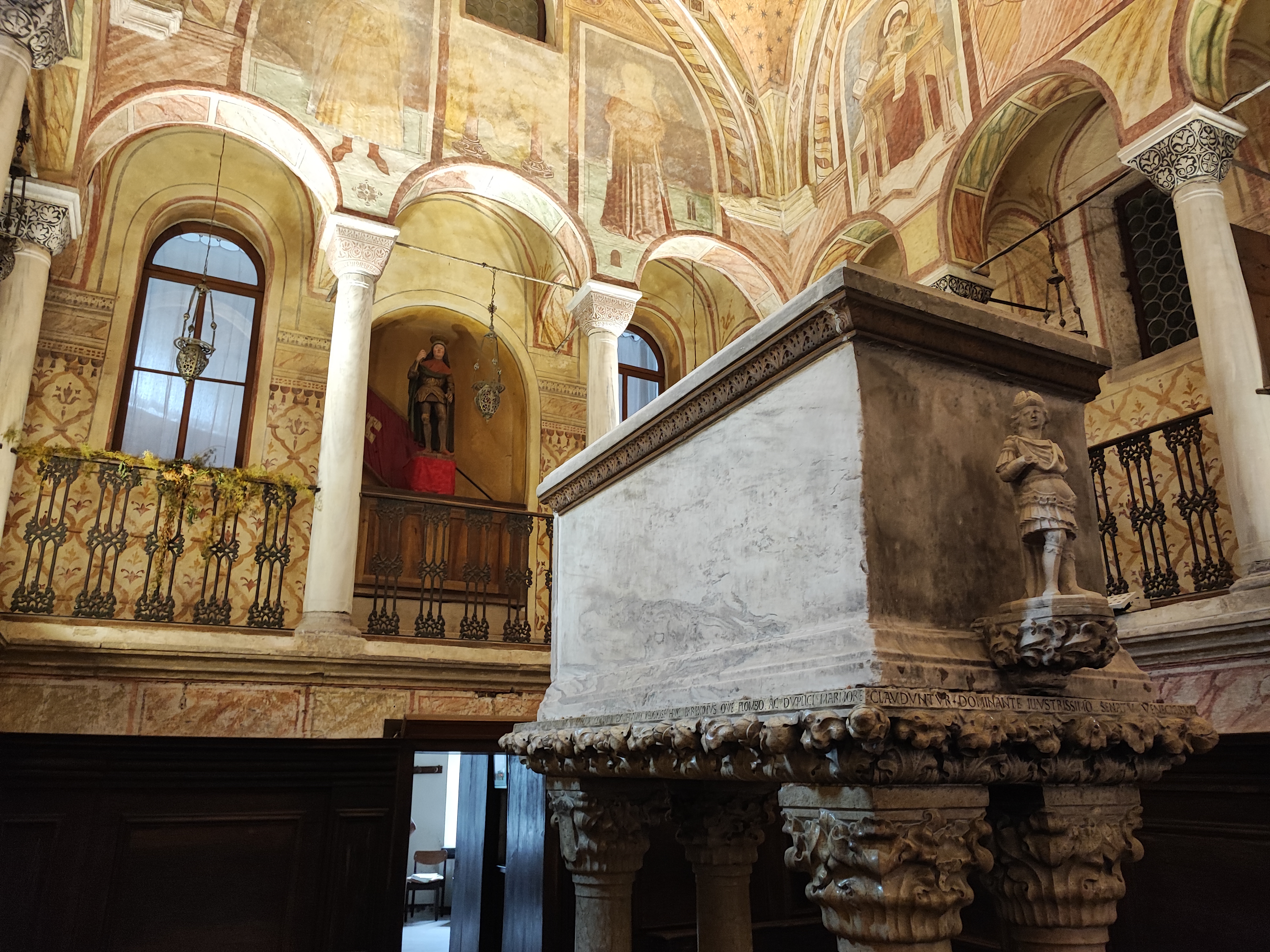 E poi si arriva al martyrium: attorno un loggiato dove le colonne hanno capitelli con iscrizioni arabe; al centro, l’urna marmorea dove sono conservate le spoglie di Vittore e Corona. La tomba fino al 1440 era appoggiata per terra. Poi fu innalzata su quattro colonne. Il complesso, che è ente ecclesiastico autonomo, si compone – oltre che della chiesa –, anche di un convento costruito sulle rovine di un castello, tra il 1494 e la fine del secolo, dai religiosi della congregazione di San Girolamo di Fiesole che vi si stabilirono fino al 1669. Successivamente risiedettero qui i padri Somaschi di san Girolamo Miani (o Emiliani) e i frati francescani Minori osservanti. Nel 1878 il santuario tornò definitivamente al clero diocesano. Nel 1932 il convento è diventato casa di accoglienza. Dal 2015 è anche sede ufficiale dell’Associazione internazionale dell’affresco, fondata dall’artista Vico Calabrò.