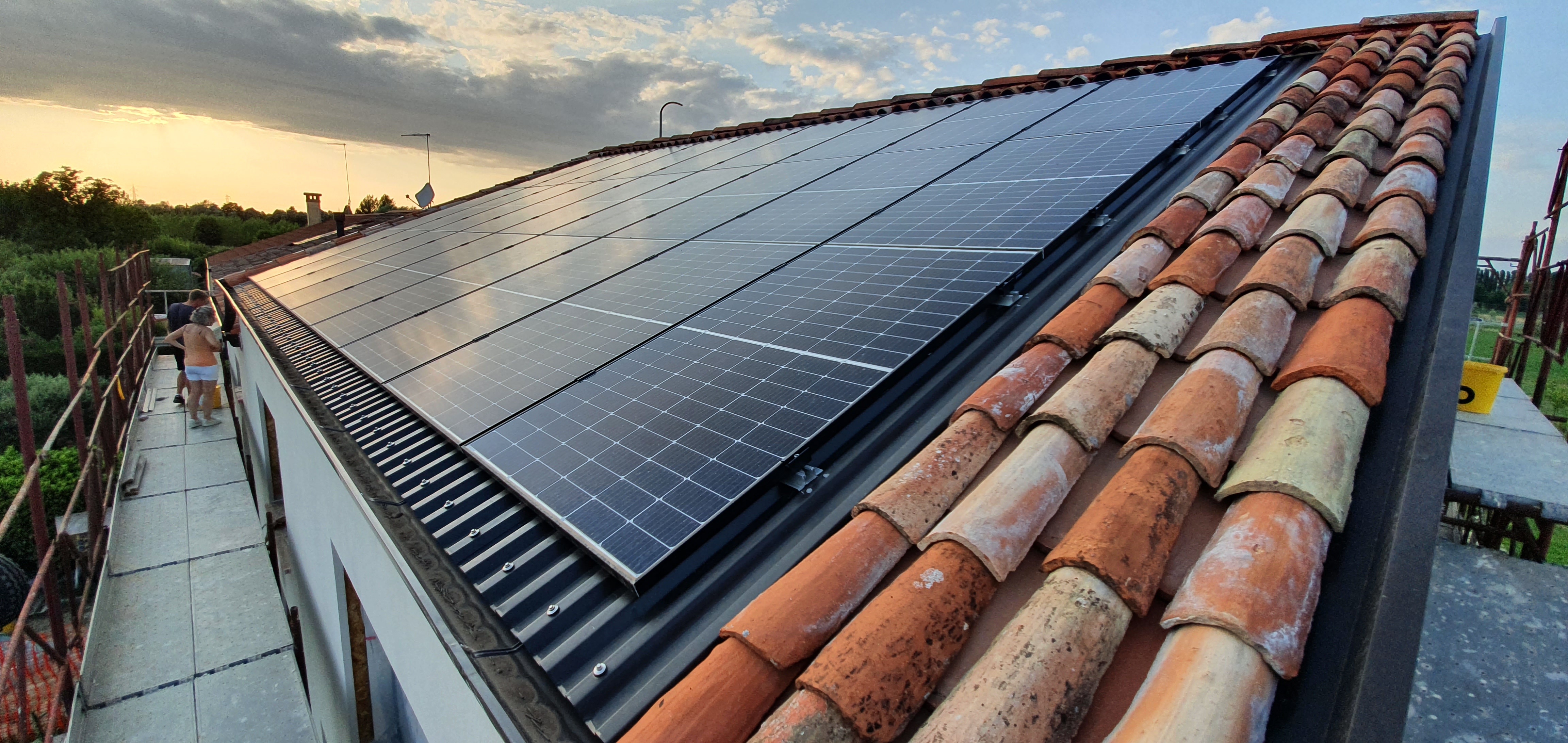 Giorgio Malavasi e Denise Tegon. Sopra, il blocco dei pannelli fotovoltaici. Nell’immagine di copertina, Giorgio è davanti allo scambiatore geotermico (scatola nera) e alla pompa