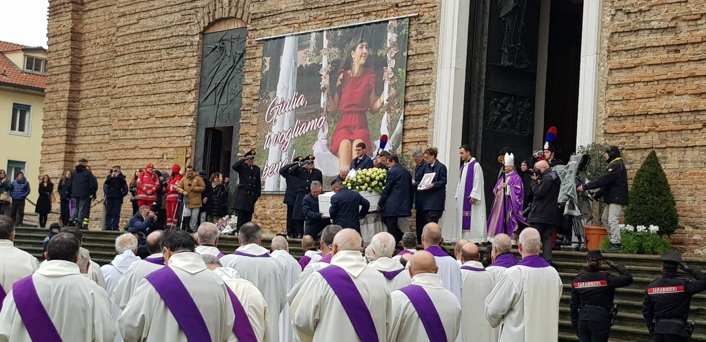 Gli schemi collocati nella piazza davanti alla chiesa riportano le immagini del rito, celebrato dal vescovo con oltre venticinque sacerdoti, tra cui padre Antonio Ramina, rettore della basilica di Sant’Antonio, e don Federico Lauretta, parroco di Santa Giustina, chiesa che custodisce anche il corpo di Elena Lucrezia Cornaro Piscopia, la prima donna laureata al mondo. Un traguardo che Giulia non ha potuto raggiungere (sarà consegnata la laurea honoris causa al papà, ndr) perché è stata uccisa l’11 novembre, cinque giorni prima della prevista discussione della tesi. «Con una crudeltà e una ferocia inspiegabili, da un ragazzo che conosceva bene – dice Linda, studentessa di Fisica -. Filippo è il compagno di banco di tutti. Forse si deve avere più paur4a di chi ti è vicino».