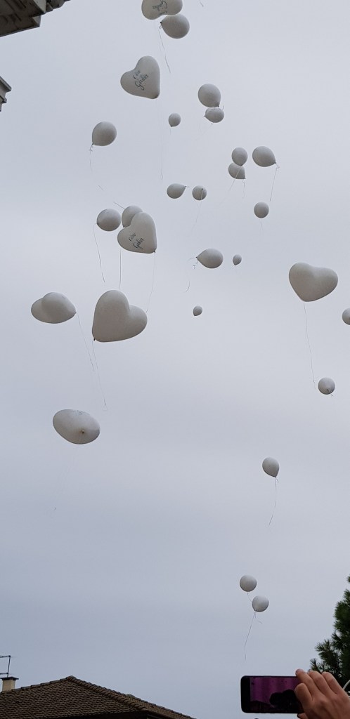 Saonara, al passaggio della bara di Giulia Cecchettin, tutti lanciano palloncini con il suo nome. Credits Romina Gobbo