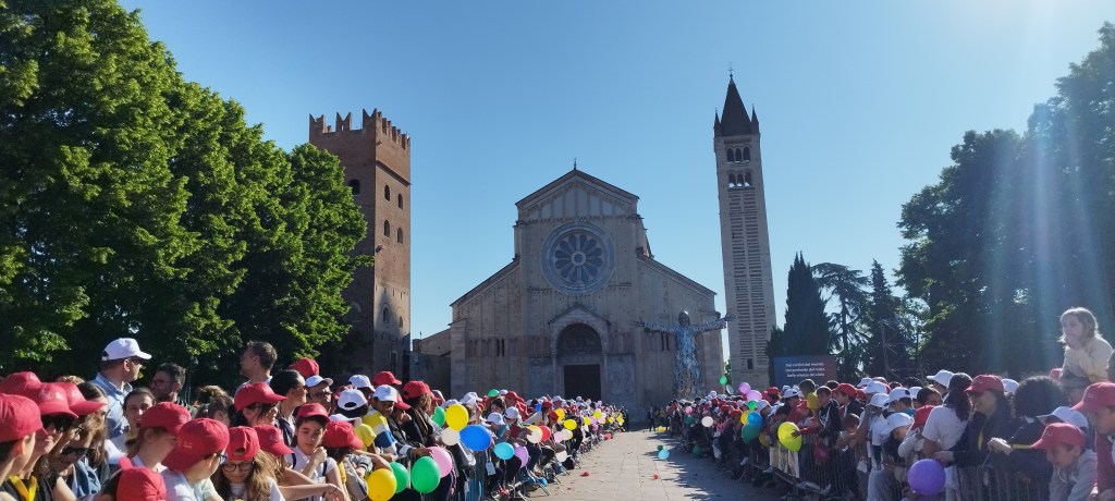Sventolio di cappellini, lancio di palloncini e tanti cori. «Viva papa Francesco», urla Gabriele, 15 anni, della parrocchia di Sant’Ambrogio di Domegliara. Dopo di lui, tutta la piazza lo imita. E quel “Viva papa Francesco” è diventato il leit motiv della festa, curata dal