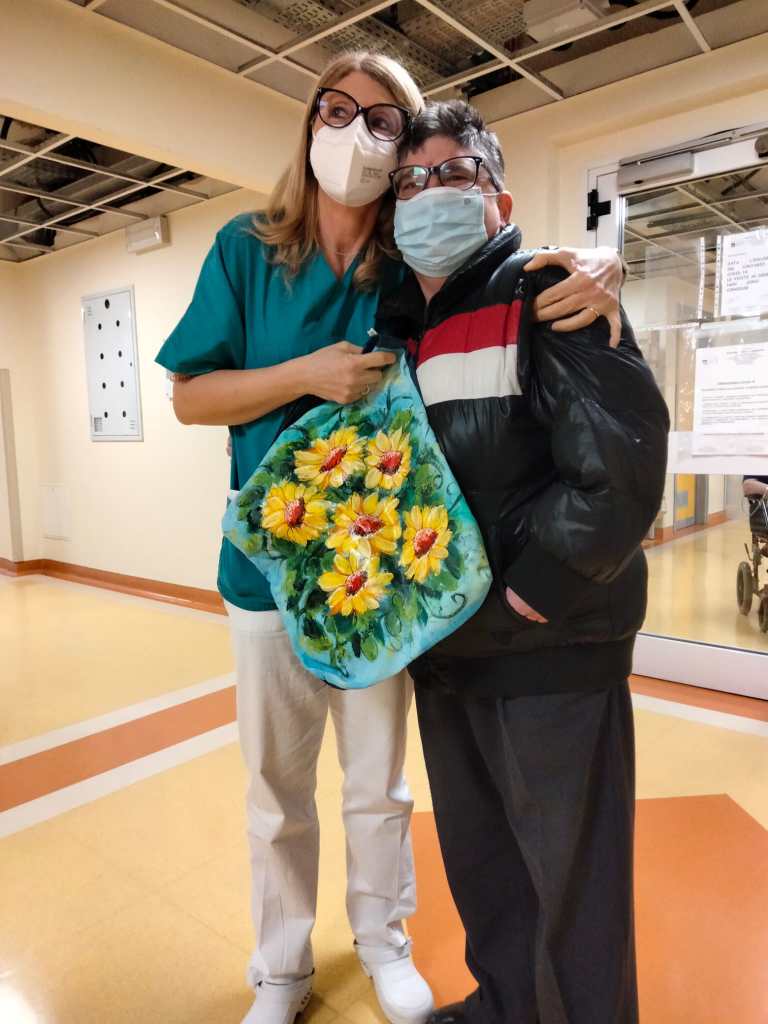 Daniele Fornasier con una dottoressa amica per la quale ha realizzato la borsa che ha in mano