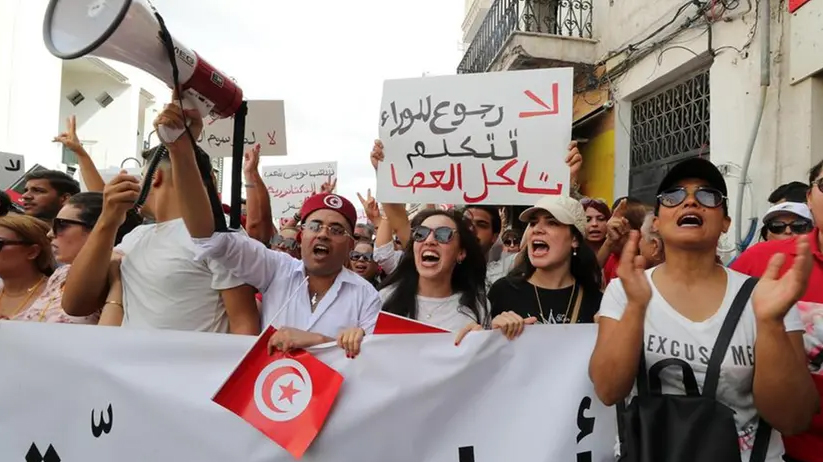 Didascalia foto: A Tunisi manifestanti in corteo contro il ricandidato presidente Kaïs Saïed (credits FOTO EPA)