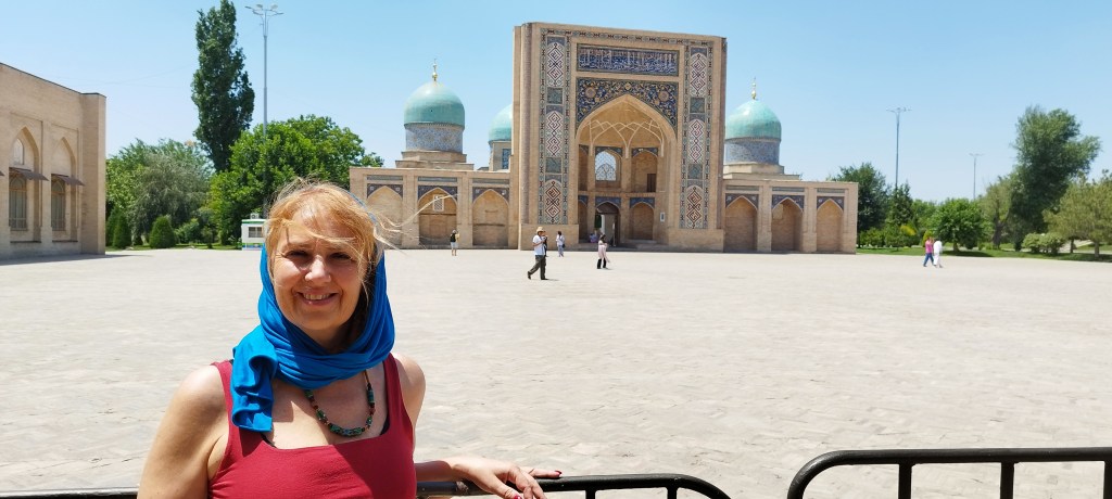 Didascalia: Romina in Uzbekistan davanti a una madrasa